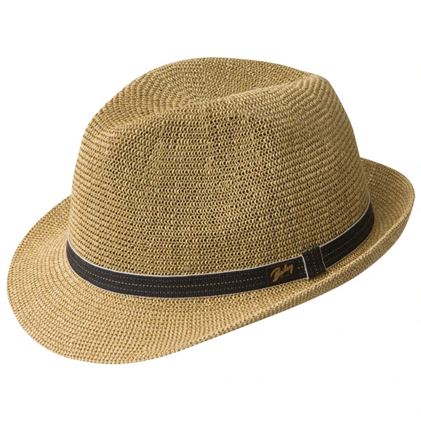 The Bailey Elliott is a straw braid trilby style fedora with a pinched front crown and snapped down 2″ brim. This contemporary looking straw hat has a simple fabric hat band and is a light breezy look for summer.