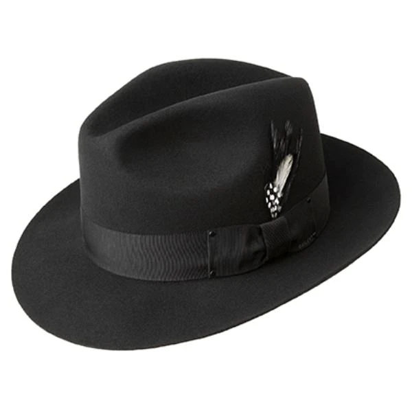 The Bailey Gangster is a 100% Wool Felt Hat. The hat has a 2 1/2″ brim and a center dent crown. The feather shown is removable. The hat is fully lined and has an interior sweatband. Made in USA.