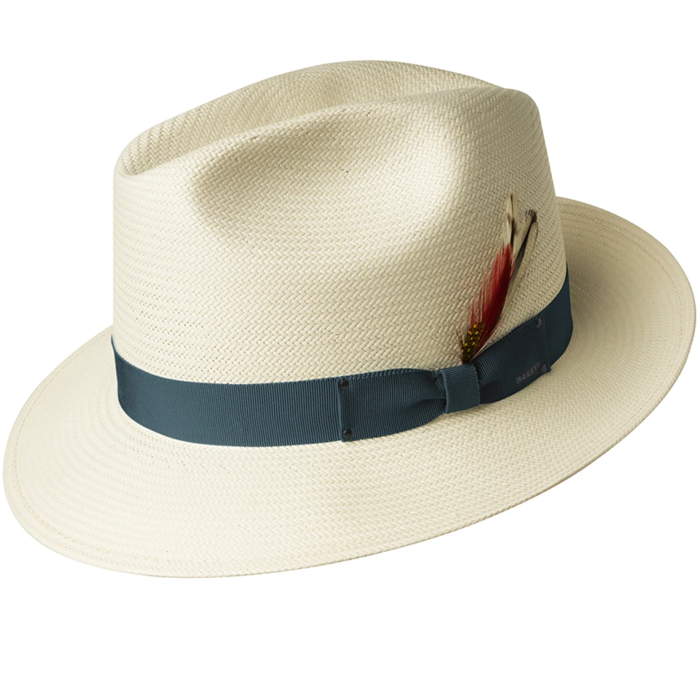 The Bailey Hanson Shantung Hat is a light Shantung fedora with a center dent crown and 2 1/2 inch snap brim. A crisp classic look, this hat is finished with a slim ribbon hat band and a removable feather. A smart choice for summer. Made in the USA.