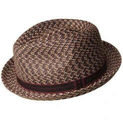 Bailey Mannes is a multi-colored braid hat with a textured hat band that goes well with the color of the hat. The low c-crown shape measures 3 3/4″; it has a pinch. Bailey Mannes has a narrow 1 5/8″ brim that is worn snapped-down at the front. The hat has a comfortable interior sweatband.