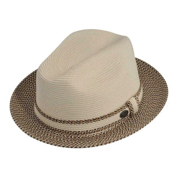 The Bailey Mannesroe Hat is a flexible braid fedora with a classic center dent crown and 2 inch snap brim. This handsome hat is multi-colored, with a solid crown and multi-braid brim. The hat band is solid braid trimmed with the same multi-color. A unique and interesting style for spring and summer.