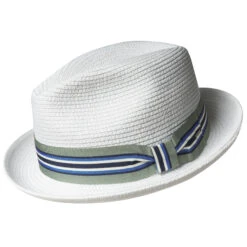 The Bailey Salem Hat is a classic braid fedora with a center dent crown and 2 inch snap brim. Flexible and soft, this hat is finished with a bright striped band for a cheerful and elegant summertime look.