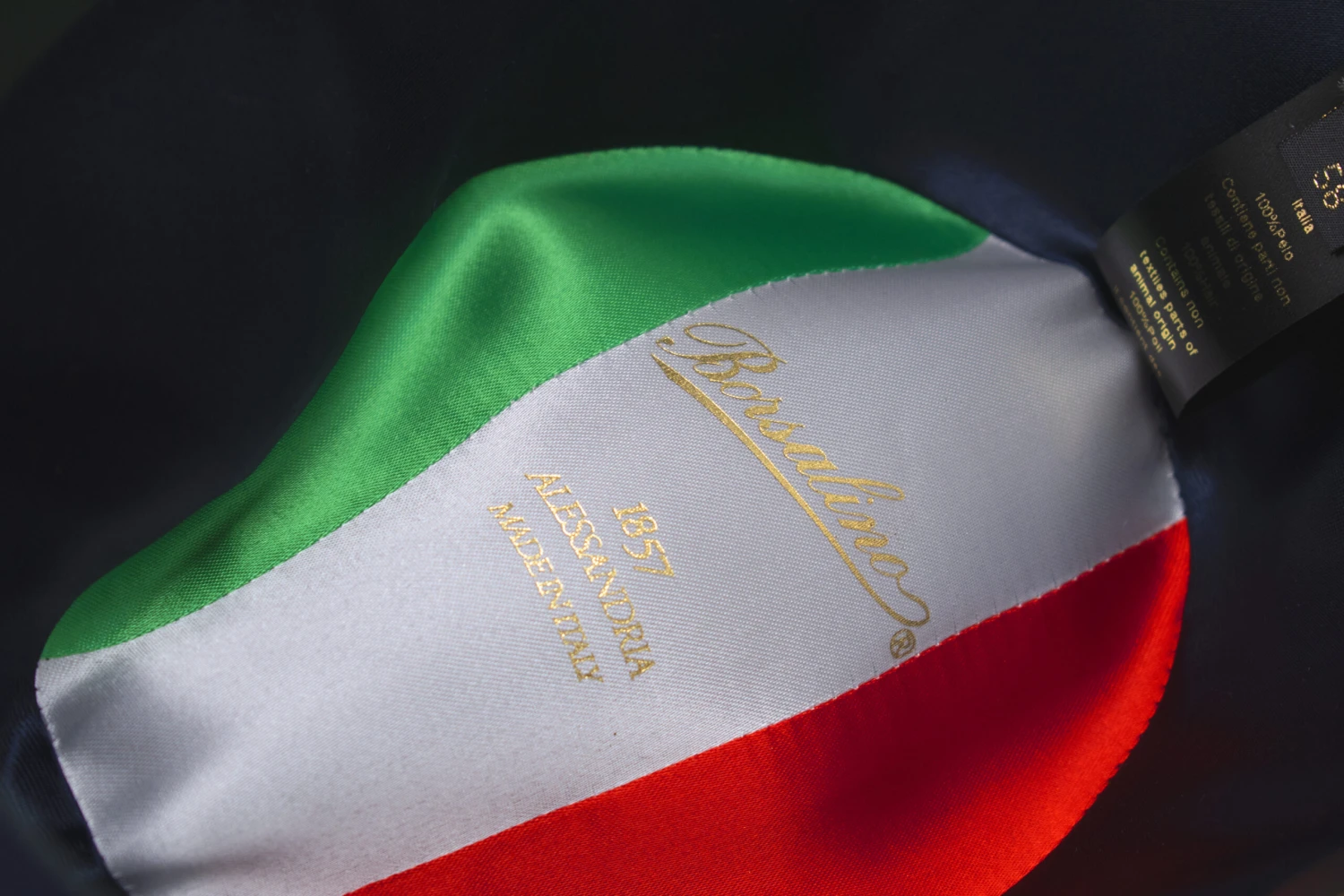 The Borsalino Limited Edition Flag Fur Felt Fedora is a Limited Edition fedora made from 100% superior quality brushed felt. This fedora features a 4 1/4″ centerdent crown, 2 1/2″ brim, grosgrain hat band, interior lining in tricolor Italian flag design, and matching tricolor hand stitching on brim. The Flag hat takes seven weeks to create by skilled artisans of the Alessandria Maison whose fine craftmanship is showcased in every piece. This 50+ step manual production process is handed down from generation to generation. A collectors piece to be treasured and enjoyed for years. Comes with matching hat box. Made in Italy.