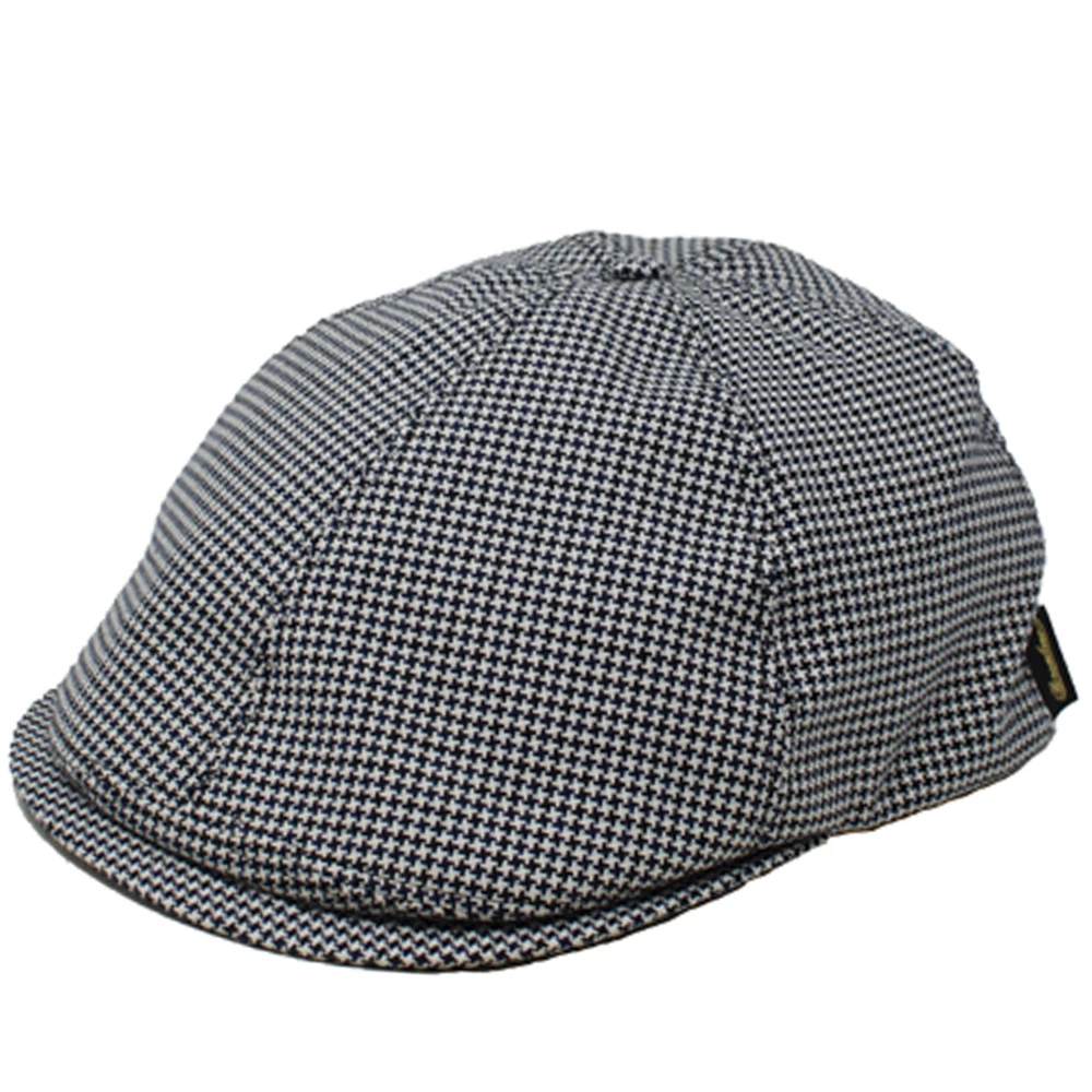 The Borsalino Six-Panel Houndstooth Pub Cap is a stylish pub cap made from 100% cotton fabric in blue and white houndstooth pattern. This cap features a six piece design, sewn peak, comfort sweatband, and interior lining. Made in Italy.