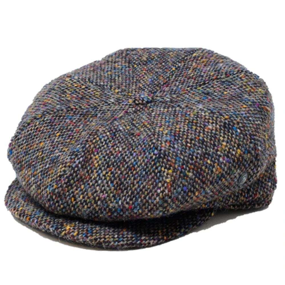 The City Sport Blaise Newsboy Classic Cap is a warm and stylish newsboy cap made from 100% Donegal Tweed wool. This cap features a sewn peak, eight-piece design, comfort sweatband, interior lining, and a rich multicolor grey tweed pattern. Made in Belgium by City Sport Caps since 1898.