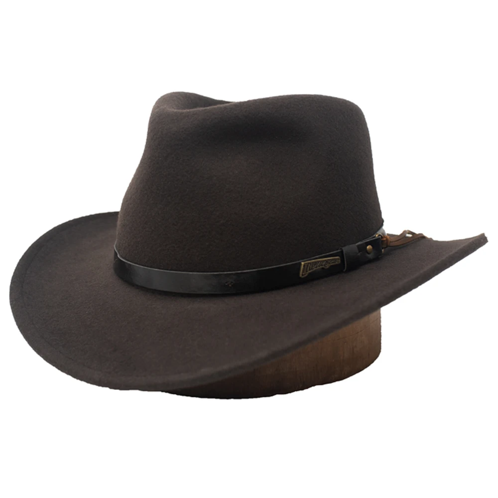 The Indiana Jones Last Crusade Wool Felt Hat is a stylish and crushable outback style hat made from 100% wool. This hat features a 4 1/4″ crown, 3″ brim with underwelt, comfort sweatband, unlined interior, and faux leather hat band with suede tails. Water repellent and easy to wear.