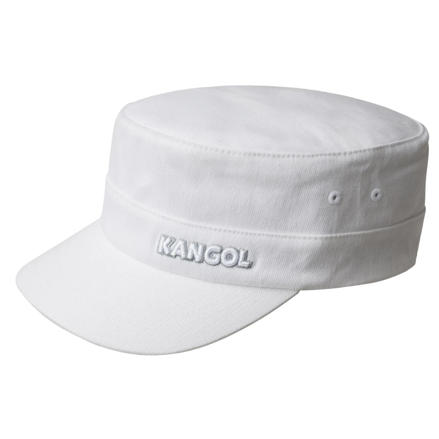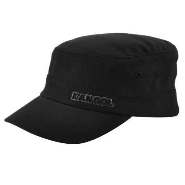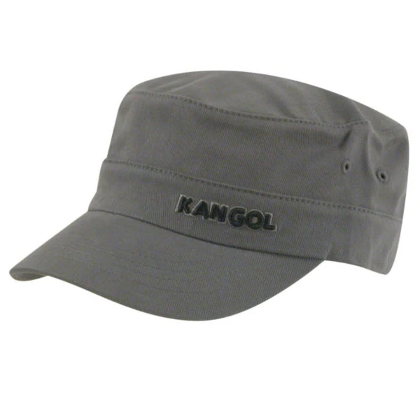 A Kangol cap with a stylish military look. This cap has the Kangol wordmark offset on the front of the cap and a folded tab on the back of the cap. There is a hidden interior pocket as well as Flexfit headband for comfortable fit.