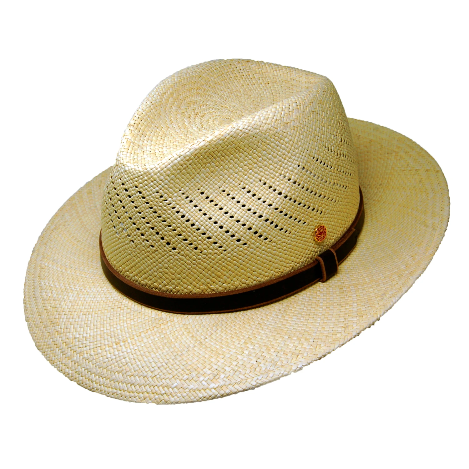 The Mayser Piero Panama Straw Hat is a stylish downbrim hat made from genuine panama straw. This panama features a 4″ crown with open weave design, 2 1/2″ brim on the sides and 2 5/8″ front and back, leather hatband, cloth sweatband, and sewn logo pin. Adhesive reinforcement at the crown protects the straw from cracking. Mayser is a premier German hatmaker that we are pleased to offer to our customers. Designed in Germany, hand-woven in Ecuador, finished in Slovakia.