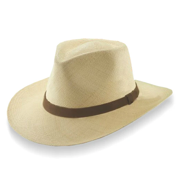 The Scala Albuquerque Panama Hat with Leather is a genuine panama sraw hat in a traditional outback style with a sloped 3 inch brim and classic teardrop crown. A slim leather hat band adds a simple rugged touch. The interior of this hat has a crown tip to prevent cracking. The Dri-Lex sweatband will keep your brow dry on hot days. A sturdy hat for summertime.