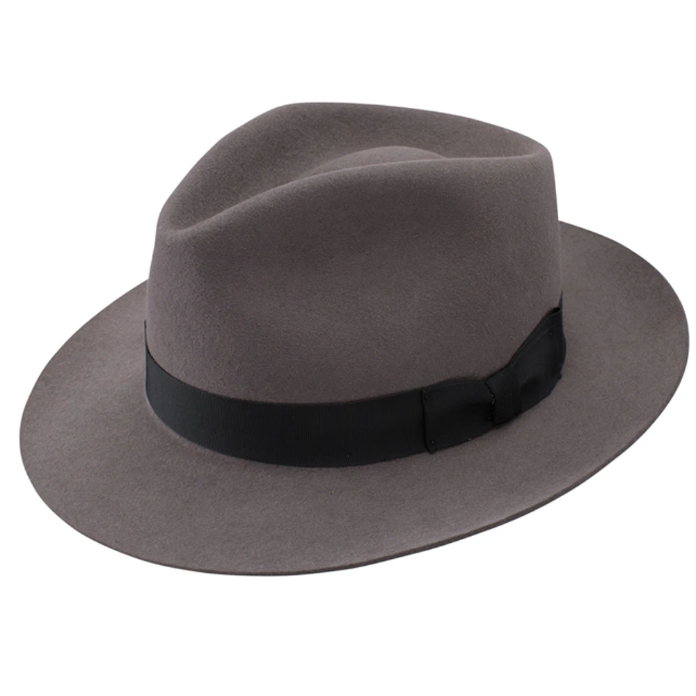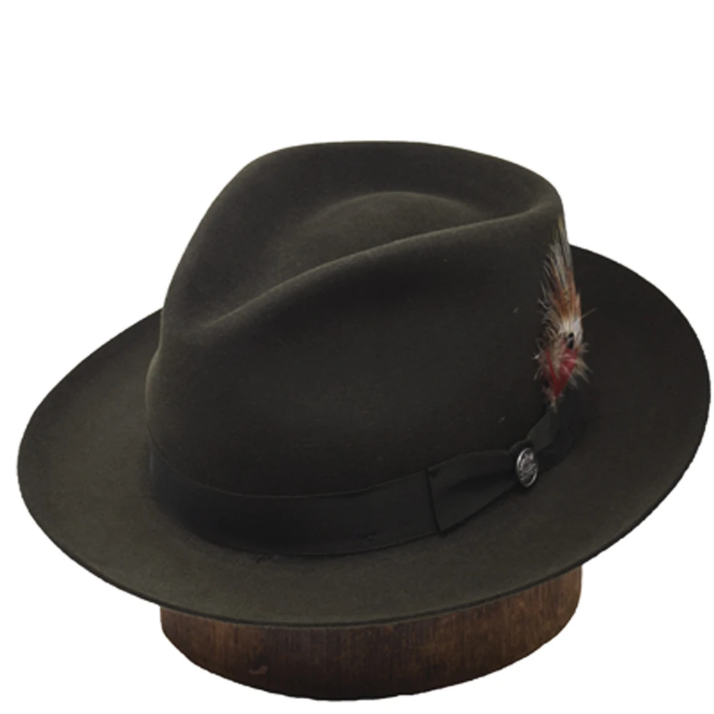 The Stetson Chatham is a Royal DeLuxe quality fur felt fedora with classic style. This fedora features a 2 3/8″ brim, a 4 1/2″ teardrop crown, genuine roan sweatband, grosgrain hat band, interior lining, and removable feather and Stetson pin. A perennial favorite, ships in a Stetson hat box. Made in the USA.