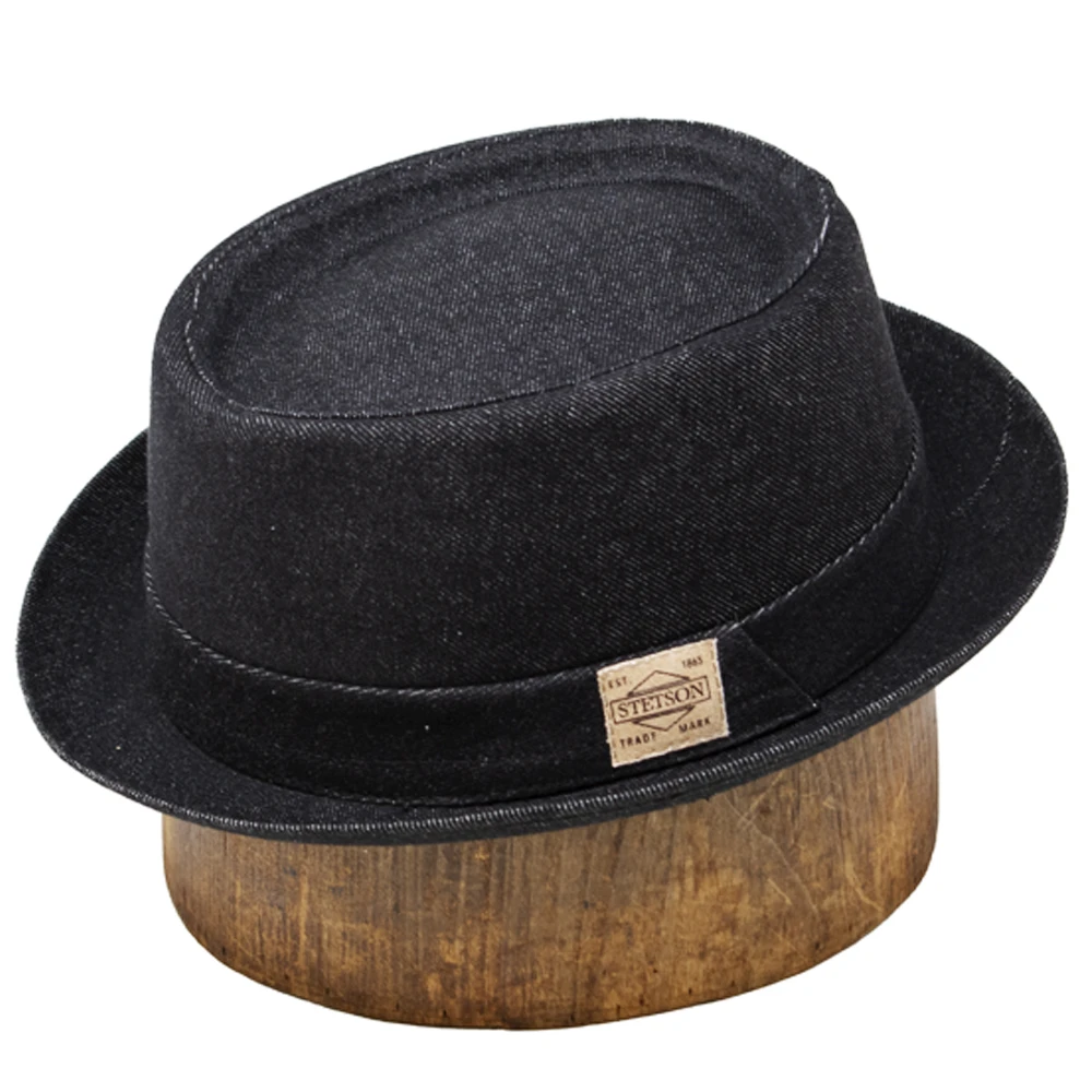 The Stetson Denim Pork Pie is a cool and stylish pork pie made from 100% cotton denim. This hat features a 3 3/4″ crown, 1 1/2″ brim, interior cotton lining, and comfort sweatband. Part of the Stetson Europe Collection. Made in Italy.