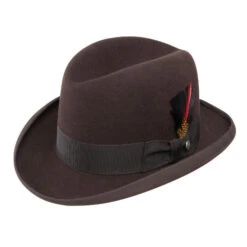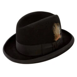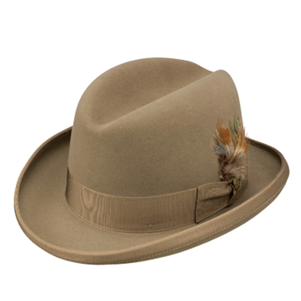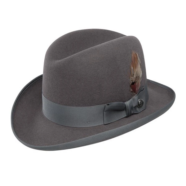 The Stetson Homburg is a genuine Royal DeLuxe fur felt hat. A distinctive, unique hat that is a throwback to the vintage days of formal hat wearing. The Stetson Homburg has a full satin lining and a leather interior sweatband. The 2 1/2″ brim is edged with a matching grosgrain binding. The 4″ crown features a grosgrain hat band and removable feather. Comes to you in a genuine Stetson hat box. Made in USA.