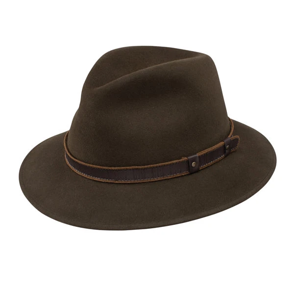 The Stetson Harrison Downbrim Fur Felt Hat is a beautiful fur felt fedora built for travel. With a handsome 2 1/2″ downbrim and a 4″ crown height, this hat has a stylish look which can be worn with a variety of outfits. It’s unique shape helps it suit anything from a dress look to a safari outfit! Finished with a leather hat band with stitching details. This hat is unlined and is finished inside with a cotton sweatband for maximum comfort! Made in the USA.